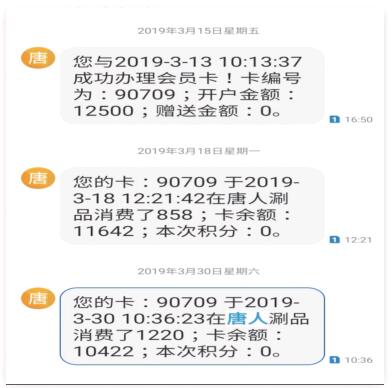“2019年3月18日消费858元,2019年3月30日消费1220元”,每次消费后,饭店都会发送一条短信,上面不仅有就餐的具体时间,还有消费金额和卡内余额。张女士觉得,办卡确实方便,每次还赠果盘,挺有面子。
