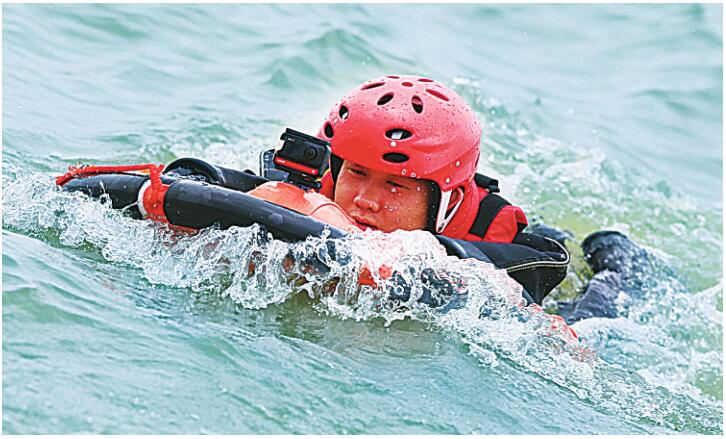 “水流湍急,橡皮艇漂浮不稳,侧翻入水中……”接着,救援队员立即实施翻舟自救。