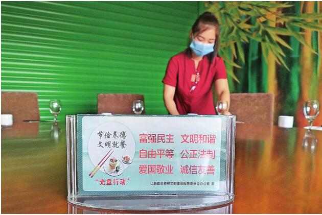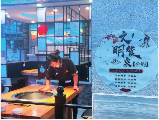 记者在东风新村的景家烤肉看到,店里的墙上张贴着“光盘行动”的公益广告。“烤肉也能打包,不少客人吃不完都会选择外带,回家热一热就能吃。”老板对记者说。