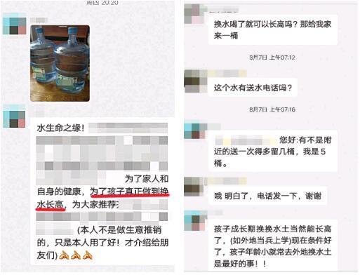 从胡女士转发来的信息中,记者看到,有人通过朋友圈和社区微信群发布消息称:孩子换水土有利于增长身高都是经过验证的,没有机会去外地换水土的孩子,将饮用水换成外地的水,也能帮孩子长高。虽然个别家长有质疑,但大多数人相信这一说法,纷纷表示想要购买外地运来的桶装纯净水。一位家长表示,由于自家孩子与同龄孩子比身高偏矮,所以,只要感觉能帮助孩子长高的办法她都愿意尝试一下,即便没有作用也无所谓,只要不会给孩子带来伤害就可以。