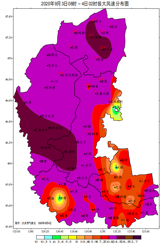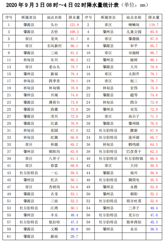 3日08时~4日02时我市全区平均降水量为68.5,其中市区平均降水量为77.1,林甸县73.0,杜尔伯特蒙古自治县55.8,肇州县61.6,肇源县72.4。全区8个站点大雨,50个站点暴雨,3个站点大暴雨(100mm以上),其中最大降雨量为121(头台)。