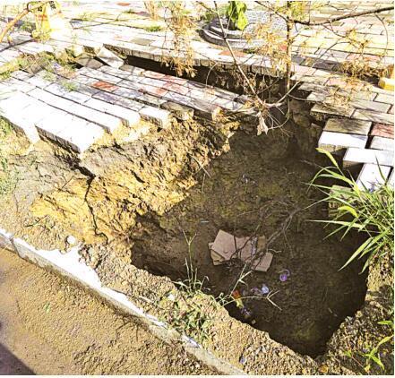 东城壹品南门人行道塌陷大坑 “挡”住行人路